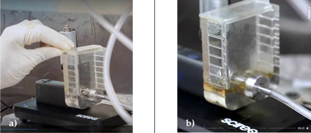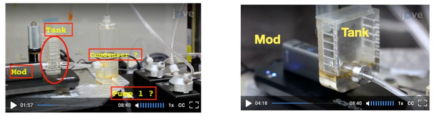 A signal of overheating can be appreciated in the published video explaining the operation of the InExpose. As shown in the figure below, at the beginning of the experiment the e-liquid is transparent (panel a)), while it takes a brownish color at the end (panel b)).