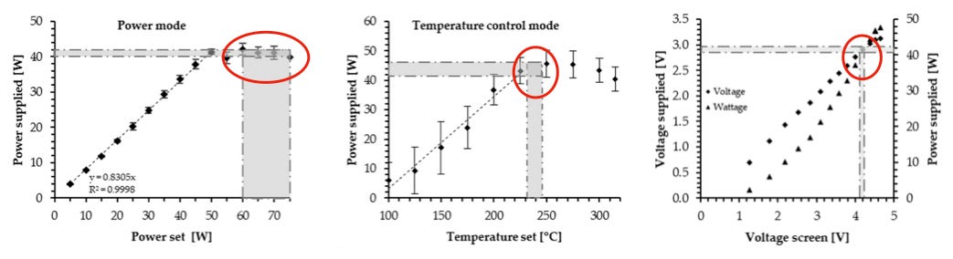 The shaded areas in the calibration graphs in figure 4 describe the power, temperature and voltage declared by at least 14 of the authors (from the instrument screen) contrasted (red circles) with the laboratory measured values in the vertical axis. Authors set power at 60-80 W, temperatures at 220-250 °C and voltage at 4-4.8 V. The calibration shows that all these screen instrument values correspond to measured supplied power of 40-45 W. A separate temperature calibration (not displayed) shows measured coil temperature of 300 °C for screen values 220-250 °C. Given this calibration, the next stage is to verify if under these power levels, coil resistance of 0.15 Ohms and the allowed airflow 1-2 L/min the Evic Mini is in the Optimal Regime.