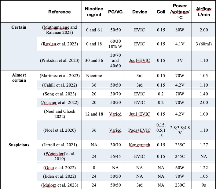 The list of the 40 studies can be found numbers in the preprint in Qeios. Notice that 9 of these 14 studies used e-liquids with nicotine concentration above 20 mg/mL, which consumers do not use in high powered devices.